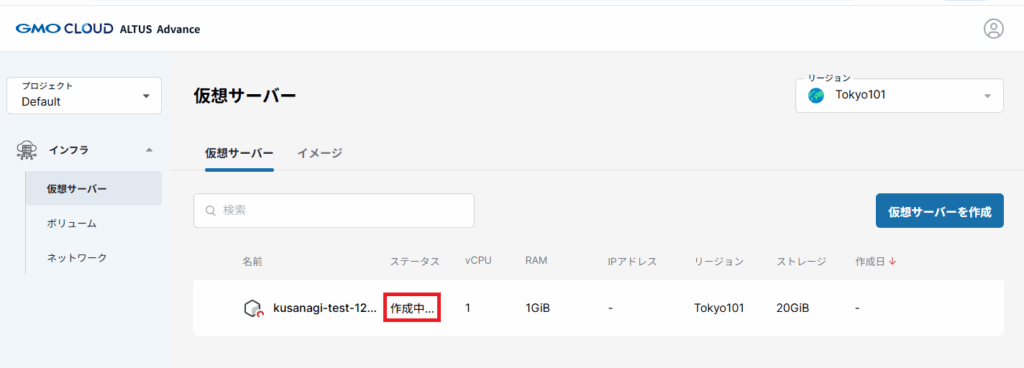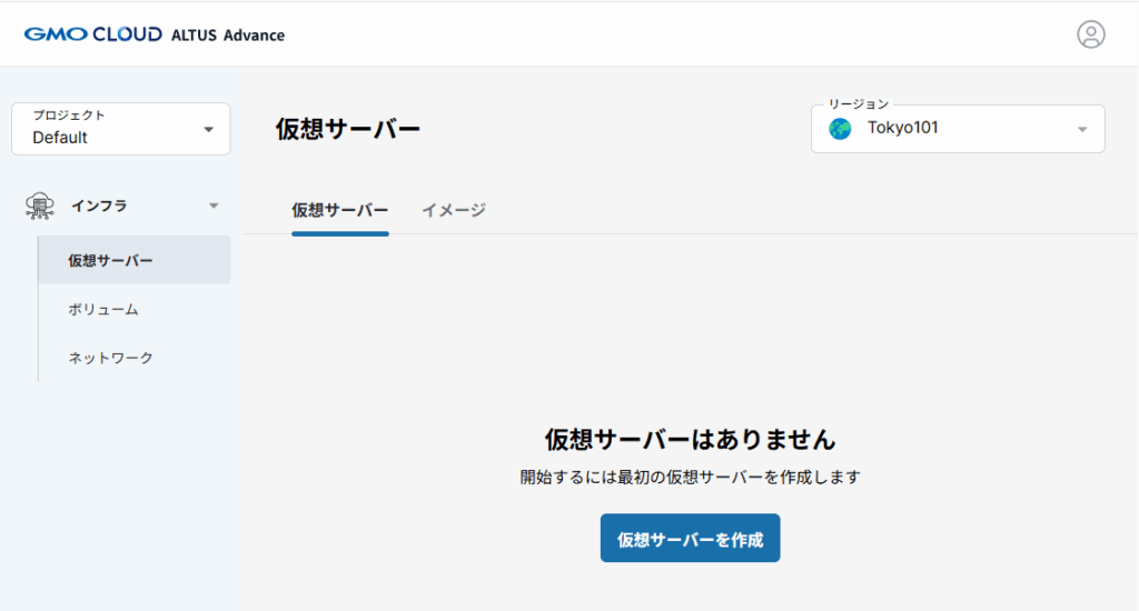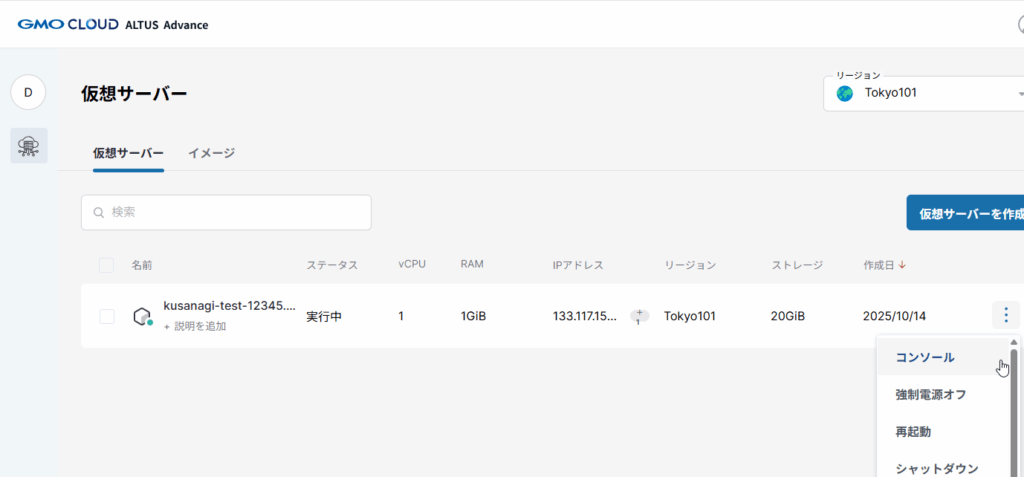 KUSANAGI 9 for GMOクラウド ALTUS Advanceの仮想サーバーを作成する手順を解説していきます。メニューより「仮想サーバー」→「仮想サーバを作成」をクリックします。