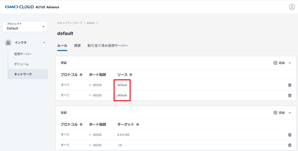 下記のように、inbound→「default」となっている場合は、記載のポート全て拒否するという意味になりますので、ここに許可するポートを追加していきます。