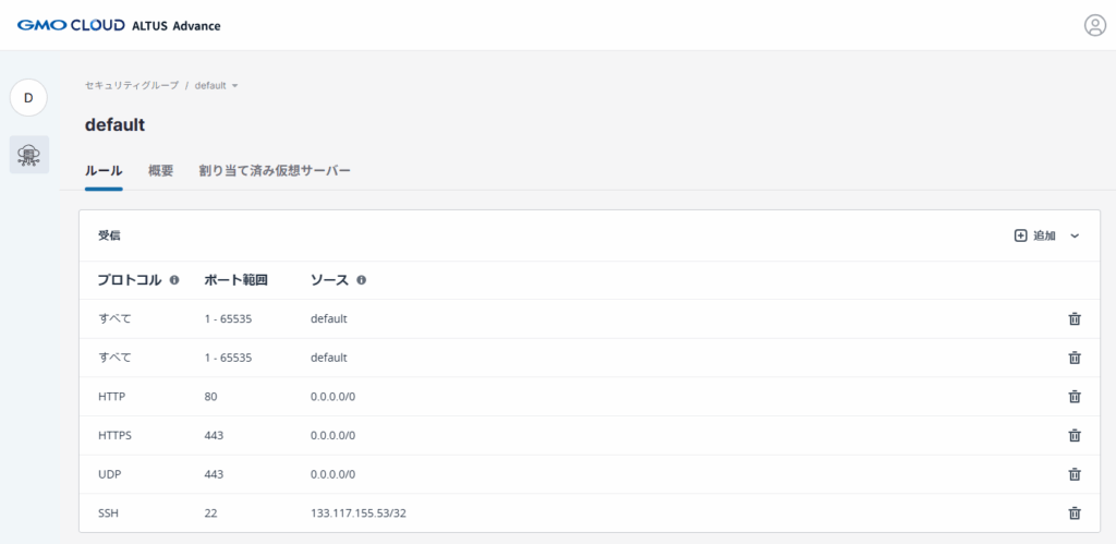 初期設定では外からVMに対しては全てポートがブロックされているので必要なポートを個々に設定する必要があります。