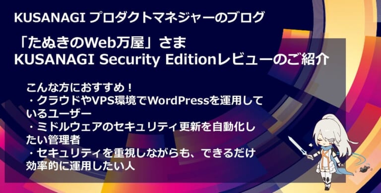 「たぬきのWeb万屋」を運営する遠藤進悟さんにKUSANAGI Security Editionを試用したレビューを頂いたので、ご紹介させていただきたいと思います。 遠藤さんはWordPerssの制作・運用サービスを提供 ...