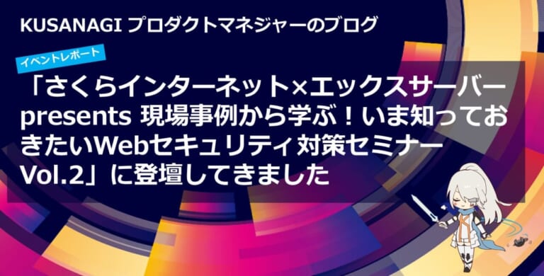 こんにちは、KUSANAGI 開発チーム、プロダクトマネジャーの相原です。エックスサーバーさんにお誘いいただき、「さくらインターネット×エックスサーバー presents 現場事例から学ぶ!いま知っておきたいWebセキュ ...